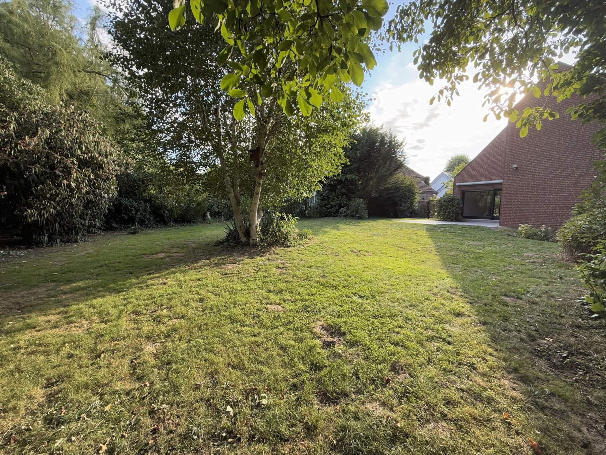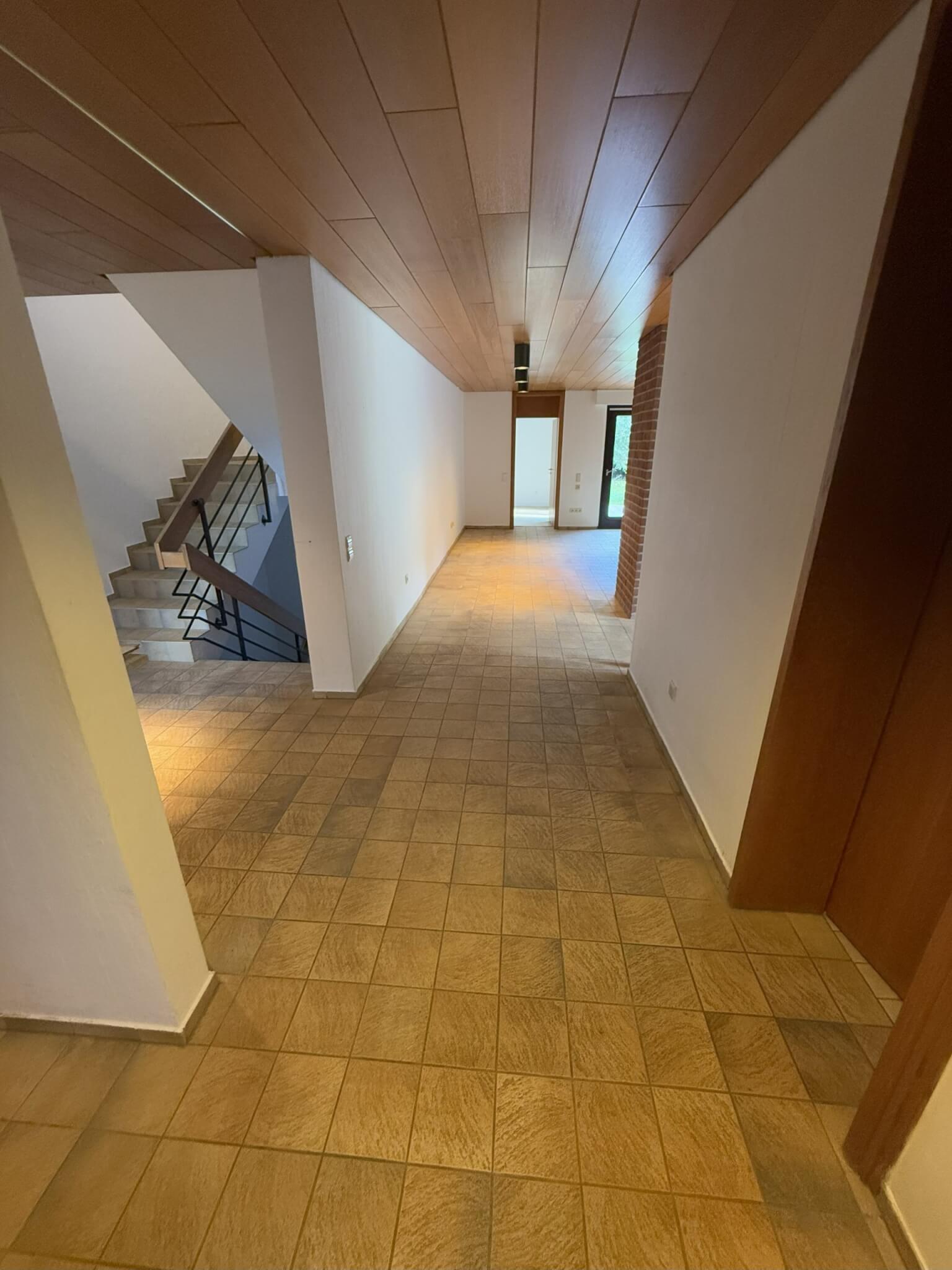 Das Haus bietet viel Platz sowie flexible Nutzungsmöglichkeiten und ist ideal geeignet für eine größere Familie, zwei Generationen-Haus und/oder Platz für das Homeoffice. Eine solide Massivbauweise verbindet Stabilität mit einem durchdachtenund gemütlichen Wohnkonzept. Die in vielen Zimmern vorhandenen großen, bodentiefen Fenster sorgen für viel Tageslicht und einen schönen Ausblick in den Garten oder auf die ruhige Spielstraße vor dem Haus. Hinter dem Haus befindet sich ein mit großen Bäumen und Büschen bepflanzter Naturwall, wodurch der Blick aus dem Garten nicht durch Häuser verstellt ist. Der gemauerte Kamin schafft eine behagliche Atmosphäre und trennt den Wohn- vom Essbereich auf stilvolle Weise. Direkt angrenzend an den Essbereich befindet sich die Küche. Der Flur- / Treppenhausbereich ist praktisch gestaltet, da er direkten Zugang zur Garage, zum Keller und einem Gäste-WC bietet. Weiterhin befindet sich im Erdgeschoß ein zum Garten ausgerichtetes Zimmer, inkl. eines Badezimmers. Das Zimmer grenzt direkt an den Wohnbereich und verfügt über einen separaten Zugang zum Garten. Der Raum ist konzipiert als Schlafzimmer, bietet durch seine Helligkeit und die vorteilhafte Raumaufteilung aber auch ideale Voraussetzungen für eine mögliche Büronutzung. Im Obergeschoss gibt es einen weiteren, großzügigen Wohn- und Nutzbereich mit mehreren Zimmern und einem Badezimmer, was viel Raum und Wohnkomfort ermöglicht. Neben einem großen Schlafbereich wären hier zwei weitere, große Kinderzimmer oder auch ein Kinderzimmer sowie ein Ankleide- oder Bürobereich denkbar. Aber auch die Gestaltung einer zweiten Wohnung im Obergeschoß ist möglich, da Wasser- und Abwasseranschlüsse für eine mögliche Küche dort vorhanden sind. Das Haus ist vollständig unterkellert. Neben dem Waschmaschinen-, Heizungs-, Hausanschluß- und Abstellraum, besteht hier die Möglichkeit, zusätzlichen Wohnraum in zwei Souterrain-Räumen mit großen Fenstern zu schaffen.